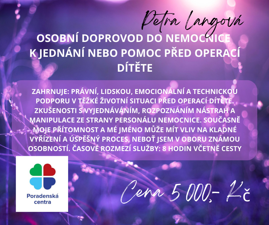 Zahrnuje: Právní, lidskou, emocionální a technickou podporu v těžké životní situaci před operací dítěte. Zkušenosti s vyjednáváním, rozpoznáním nástrah a manipulace ze strany personálu nemocnice. Současně moje přítomnost a mé jméno může mít vliv na kladné vyřízení a úspěšný proces, neboť jsem v oboru známou osobností. Časové rozmezí služby: 8 hodin včetně cesty.