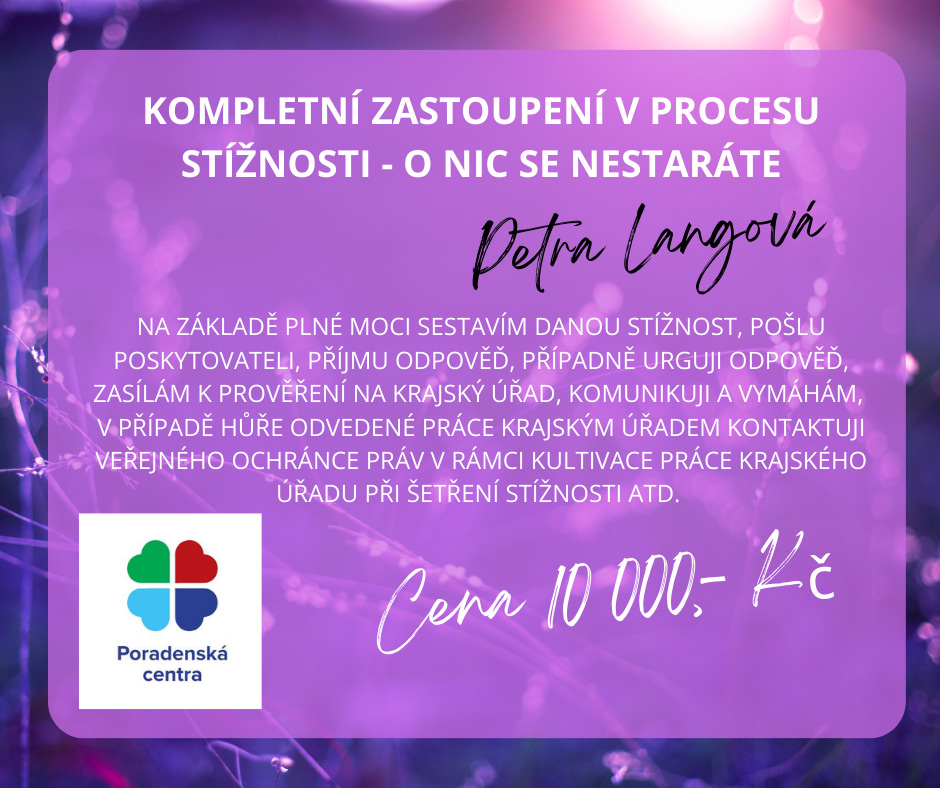 Voucher zahrnuje: Na základě Plné moci sestavím danou stížnost, pošlu poskytovateli, příjmu odpověď, případně urguji odpověď, zasílám k prověření na Krajský úřad, komunikuji a vymáhám, v případě hůře odvedené práce Krajským úřadem kontaktuji Veřejného ochránce práv v rámci kultivace práce Krajského úřadu při šetření stížnosti. Pakliže bude stížnost důvodná a vznikla újma, po dohodě je možné předžalobní výzvou žádat odškodné ve spolupráci s naší špičkovou advokátkou na toto téma. Zahrnuje také úpravu textu, vyhledávání judikátů a atestovanou lékařku pro konzultaci.
